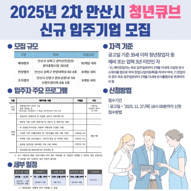 이미지 확대보기모집 대상은 39세 이하 청년창업자 중 예비 또는 업력 3년 미만인 기업이며, 입주 기간은 최대 2년까지 가능하다. 선정된 기업은 오는 2026년 1월 중 입주할 예정이며 최초 입주일로부터 3개월 이내 본사 소재지를 입주한 캠프로 변경해야 한다.