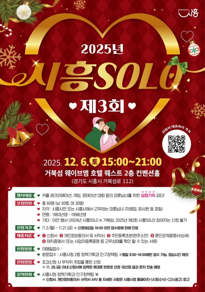 올해로 3회째를 맞는 ‘시흥솔로(SOLO) 행사’는 지난 2024년 제1회 개최 시에 남녀 60명을 대상으로 커플 16쌍 매칭에 성공해 53%의 매칭률과 88%의 참여자 만족도를 기록했다. 올해 상반기에 열린 제2회 행사에서는 남녀 40명 중 13쌍(매칭률 65%)이 커플로 탄생했으며, 만족도는 92%로 더욱 높아졌다.