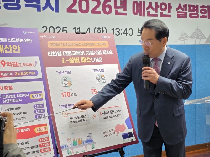 이미지 확대보기인천시는 2026년도 예산안을 네 가지 축으로 분류했다. “시민행복 체감사업(3.8조 원), i+ 1억드림 646억 원, i+ 길러드림 10억 원, i+ 집드림 114억 원, K-패스 및 인천 i-패스 658억 원, i-바다패스 100억 원, 75세 이상 어르신 무료 교통복지 i-실버패스 신설(170억 원)”이다