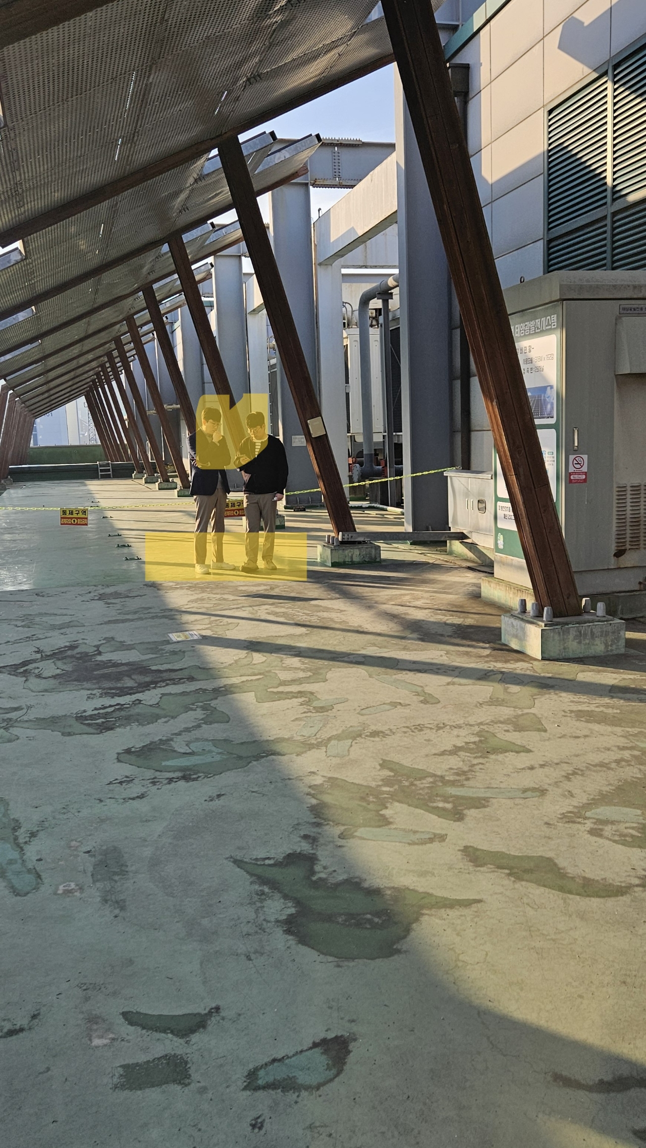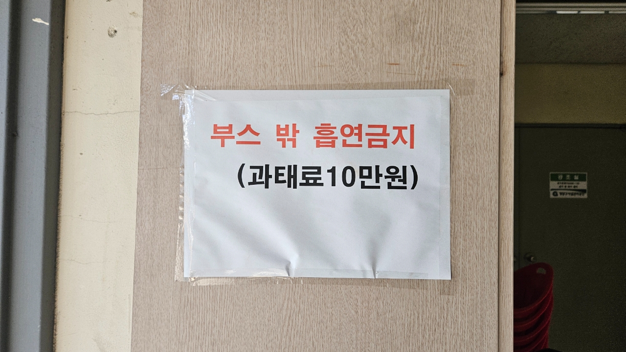 취재진이 재차 옥상에 방문해보니 뒤쪽으로 가지 못하게 줄이 처 있지만 여전히 흡연자들은 바깥에서 흡연을 하며 침도 뱉기도 하고 부스 안에서는 텅 비워 있었다.