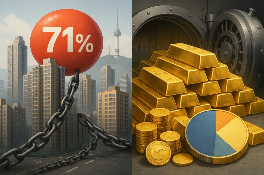 한국은행과 통계청이 2025년 7월 발표한 자료에서, 2024년 말 기준 국부의 71%는 부동산이다. 가계자산의 부동산 편중은 더욱 두드러진다. 그 비중이 무려 74.6%에 이른다.
