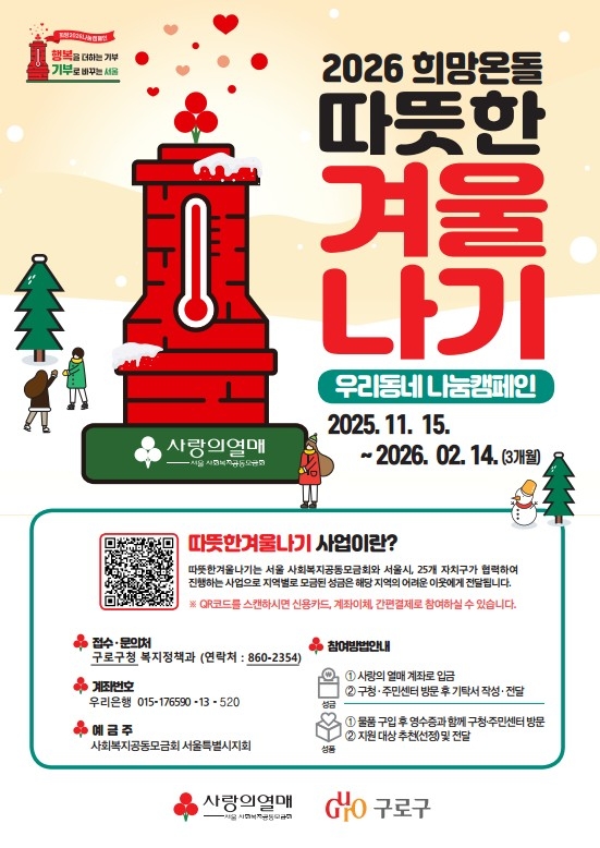 구로구는 이번 사업을 홍보하기 위해 이달 18일 구로구청 강당에서 ‘2026 희망온돌 따뜻한 겨울나기 사업’ 선포식을 개최한다.