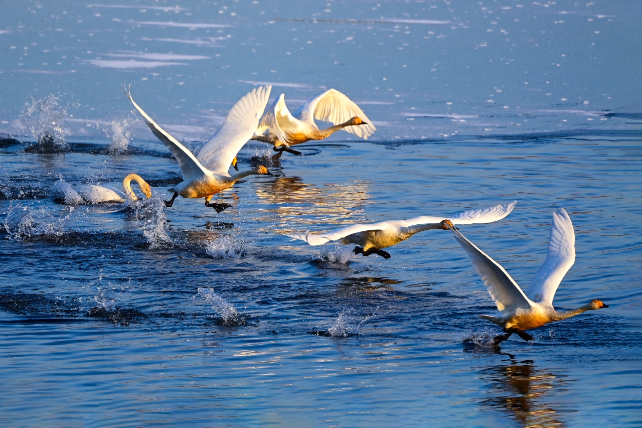 경기도 광주시 팔당물안개공원에 찾아온 백조들이 호수 위를 미끄러지듯 날고 있다. 사진=광주시