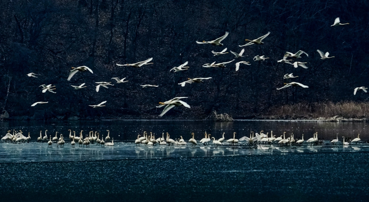 짙은 물안개가 감도는 팔당물안개공원에 흰 날개를 휘날리는 백조들이 찾아왔다.