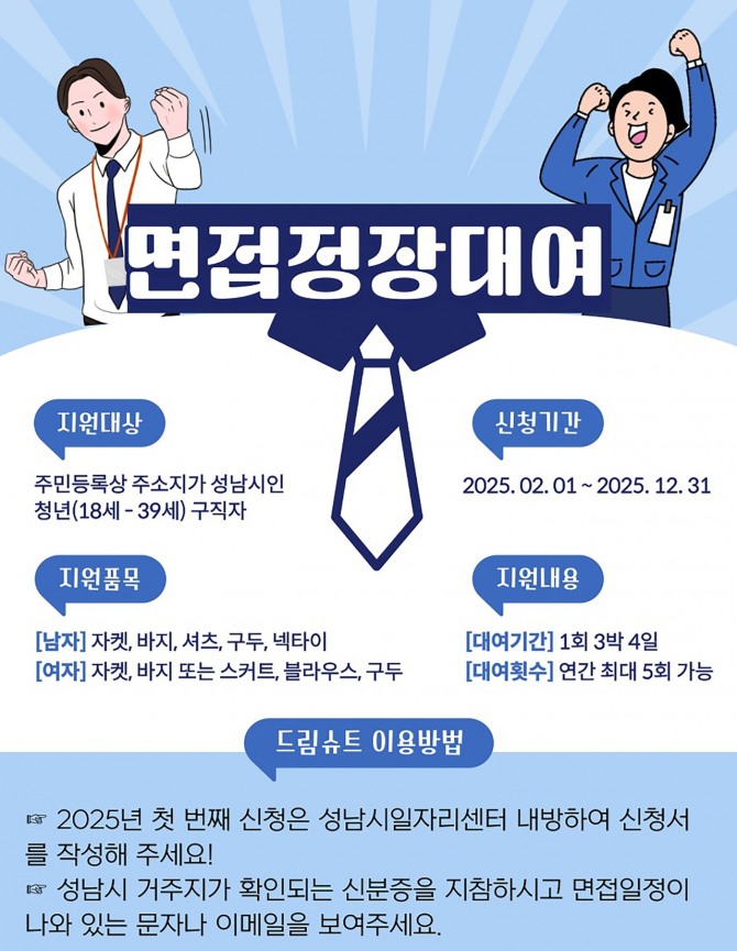 이 사업은 성남시에 주소를 둔 만 18세~39세 이하 청년 중 면접을 앞둔 이들을 대상으로 하며, 재킷, 바지, 스커트, 셔츠, 블라우스, 넥타이, 벨트, 구두 등 면접정장 일체를 1인당 연간 5회까지, 회당 3박 4일간 무료 대여할 수 있다.