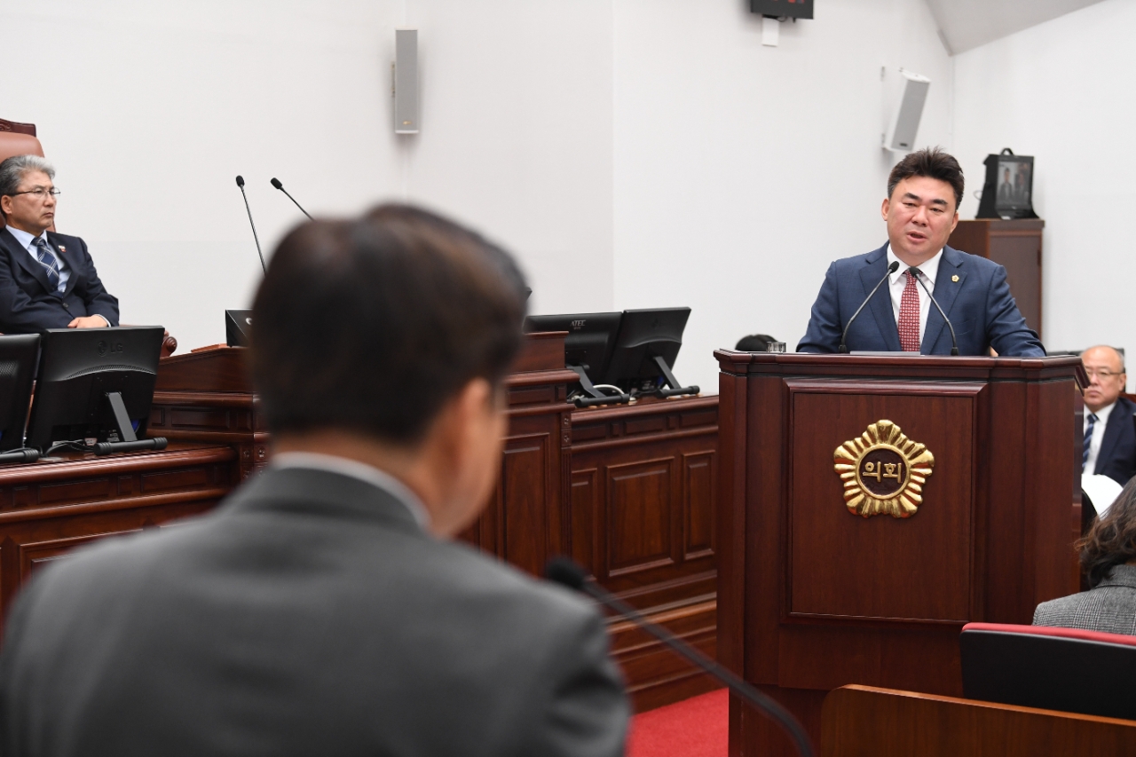 이미지 확대보기강충룡 부의장은 저출산 여파로 소규모 공립 병설유치원이 유아 수 감소, 휴·폐원 위기, 행정인력 부족 등 다양한 어려움에 직면해 있다고 지적했다.