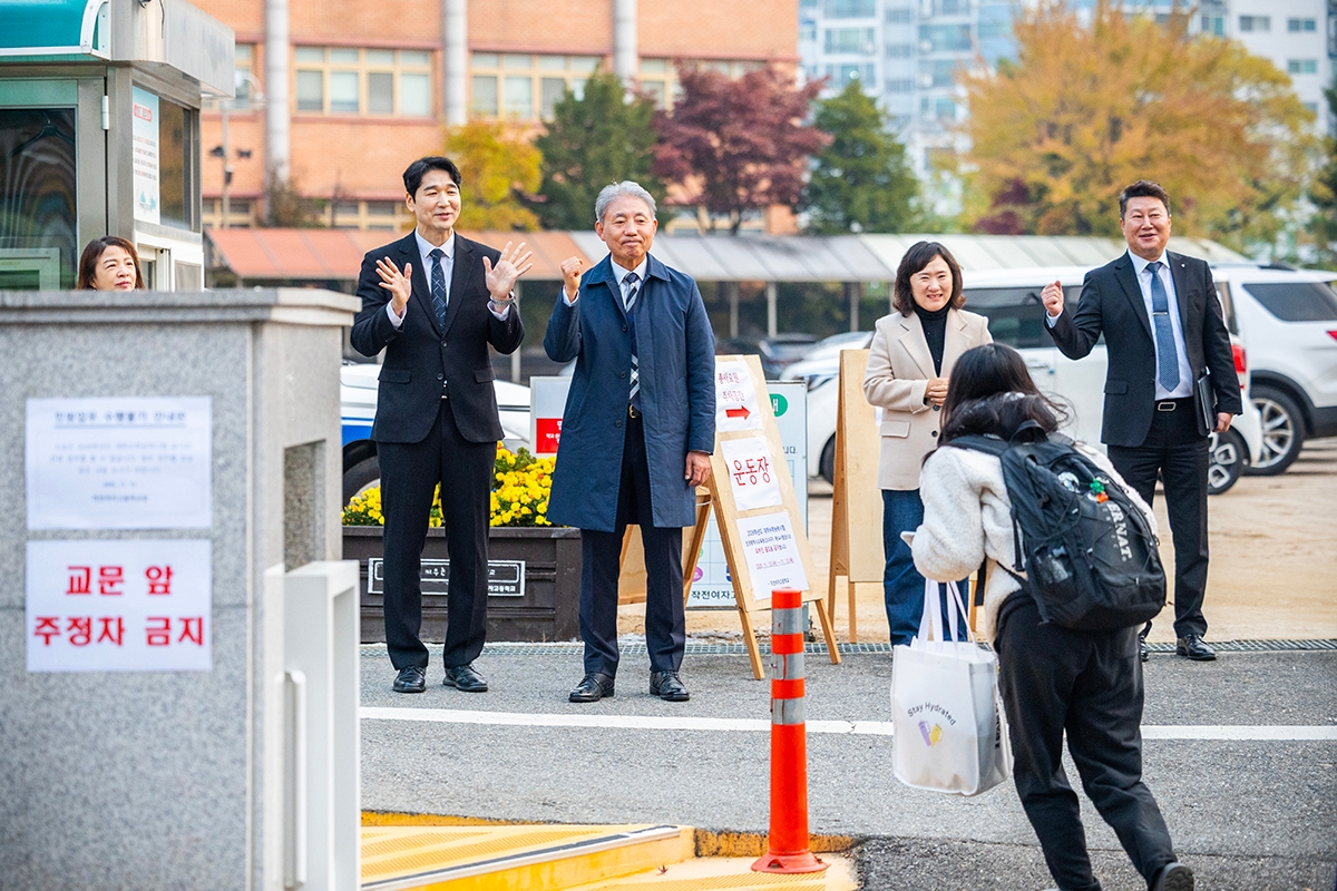 또한, 고사장 앞 자녀를 배웅하러 나온 학부모들에게도 “그동안 묵묵히 함께 걸어주신 부모님들의 노고에 깊이 감사드린다.”라며 “오늘 하루만큼은 수험생과 가족 모두가 한마음으로 서로를 응원하며 따뜻한 마음으로 보내시길 바란다.”라고 인사를 전했다.