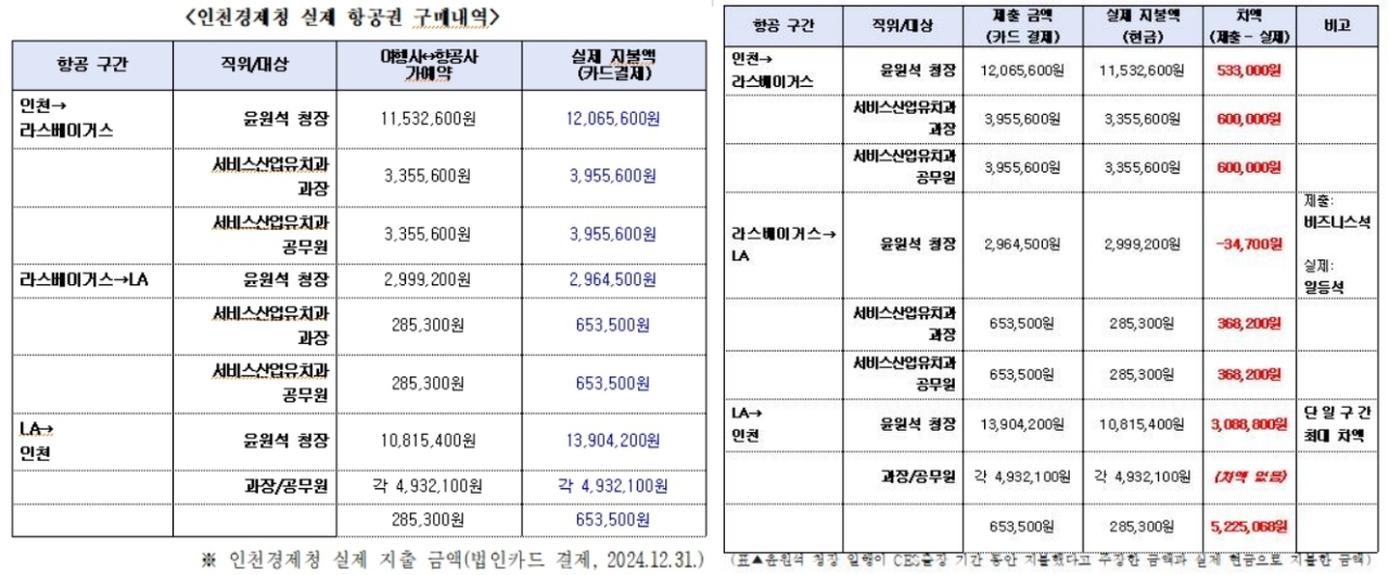 이는 △윤원석 청장(비즈니스석) 인천→라스베이거스 : 1206만 5600원, 라스베이거스→LA : 296만 4500원, LA→인천 : 1390만 4200원 △서비스산업유치과 과장·직원(이코노미석) 인천→라스베이거스 : 각 395만 5600원, 라스베이거스→LA : 각 65만3500원, LA→인천 : 각 493만 2100원, 청장만 비즈니스석, 나머지는 전원 이코노미석으로 탑승했다는 것이다.