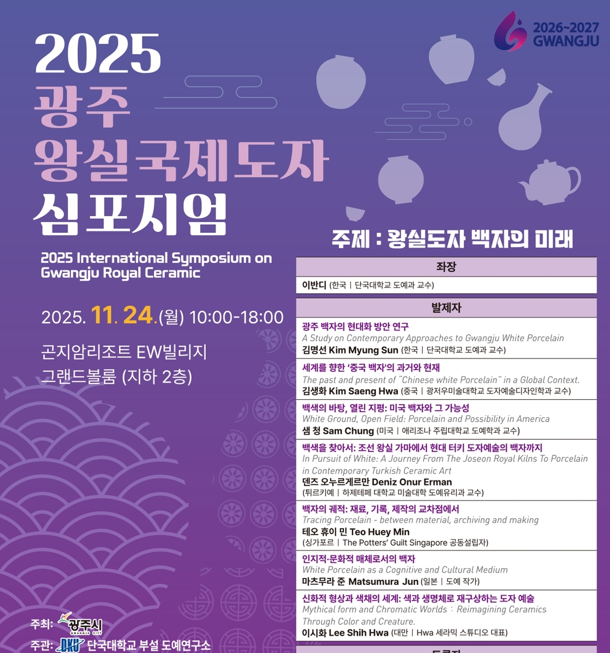 참석자들은 국제적 시각에서 ‘광주왕실 도자’의 역사적 가치와 브랜드 경쟁력을 논의하고, 광주 도자의 글로벌 위상 강화 방안을 함께 살펴볼 예정이다.