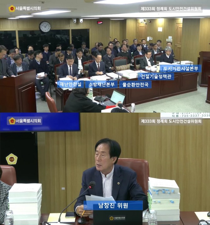 이미지 확대보기17일 서울시의회에 따르면 도시안전건설위원회 남창진 의원(국민의힘, 송파2)은 지난 14일 소관기관인 서울시 △재난안전실 △소방재난본부 △물순환안전국 △서울물재생시설공단 △건설기술정책관 △도시기반시설본부 시설국 총 6개 기관의 종합감사를 실시하면서 재난 발생 속도에 비해 서울시의 대응 속도가 느리다고 질책했다.