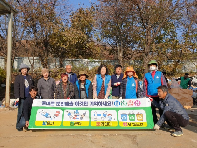 이날 새마을지도자회와 주민자치위원회는 관내 재활용 선별장을 방문해 혼합 배출된 폐기물을 재활용 가능과 불가능한 품목으로 분류하는 등 구슬땀을 흘렸다.