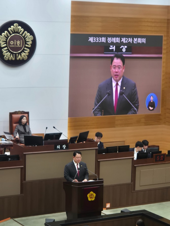 이미지 확대보기이 날 열린 서울시의회 정례회 본회의 서울시의회 국민의힘의 교섭단체 대표연설에서 이 대표의원은 서울시와 서울시교육청에 대해 내년도 예산안에 대한 철저한 심의와 협력을 약속했다.