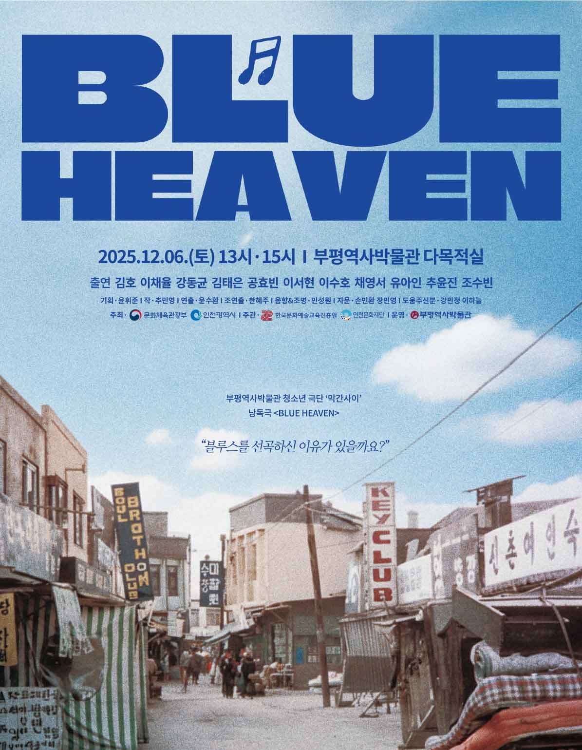 이미지 확대보기‘BLUE HEAVEN’은 1970년대 초반 ‘부평 미군부대’를 배경으로 한 청소년 밴드 이야기로, 오는 12월 6일 오후 1시와 3시(총 2회)에 박물관 다목적실에서 열린다.