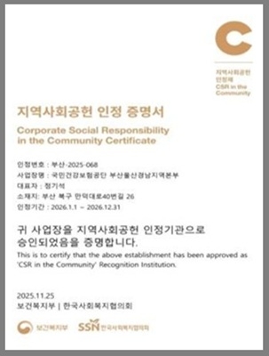 이미지 확대보기‘지역사회공헌 인정제’는 기관이 보유한 인적·물적 자원을 활용하여 비영리단체와의 협력을 통해 지역사회의 복지 증진에 공헌하는 기관을 인정해 주는 제도로 부울경본부는 지난 2023년부터 3년 연속으로 지역사회공헌 인정기관으로 선정되었다.