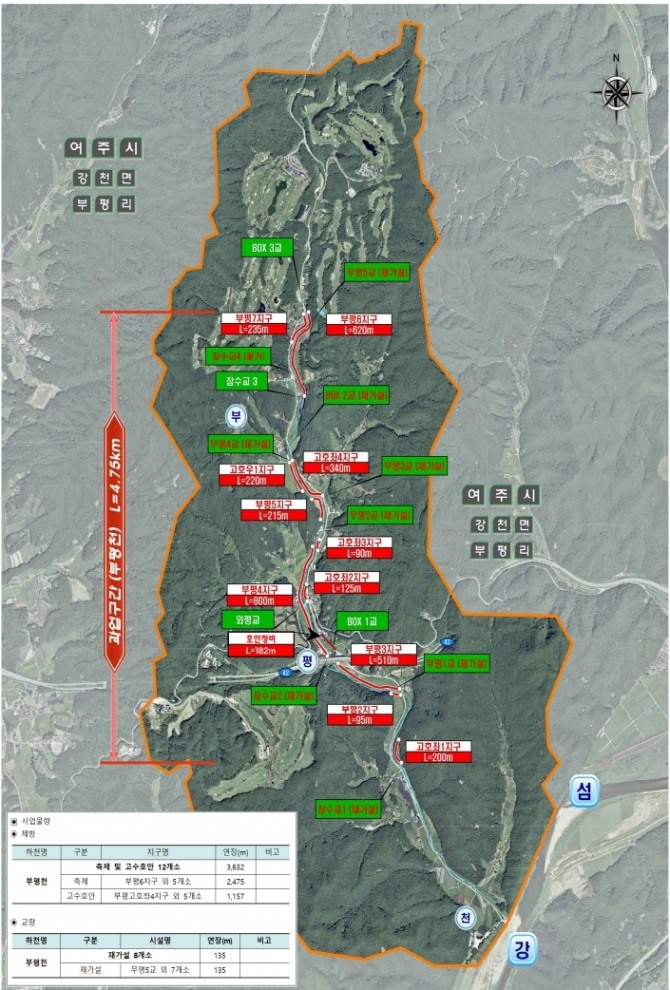 이미지 확대보기부평천은 여주시 강천면 일원을 흐르는 지방하천으로, 섬강을 거쳐 남한강으로 합류한다. 상류부는 급경사 지형으로 집중호우 시 물이 빠르게 불어나 주변 농경지 침수가 반복돼 왔으며, 하류부는 남한강 수위 상승 시 역류성 범람 위험이 상존해 정비 필요성이 꾸준히 제기돼 왔다.