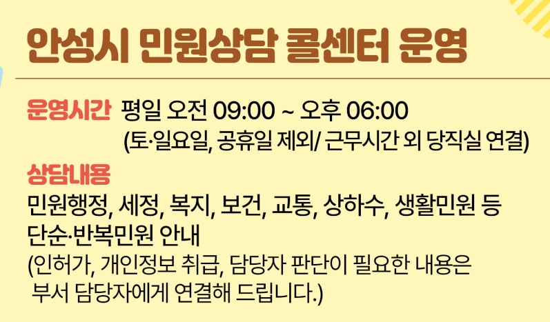 시 민원상담 콜센터는 평일 오전 9시부터 오후 6시까지 민원행정, 세정, 복지, 상하수도 등 시민 생활과 밀접한 다양한 분야의 상담을 제공하고 있다.
