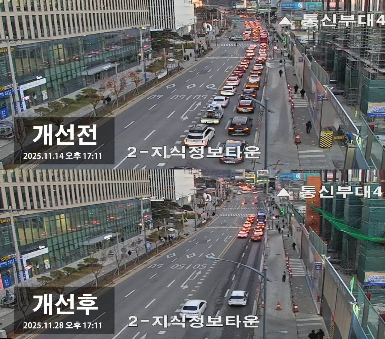 교통량 변화 분석을 위해 시는 AI 기반 스마트 교차로 시스템을 활용해 일정 기간 지식정보타운 일대 교통량을 모니터링했으며, 수집된 데이터를 분석해 과천대로(지식정보타운 구간)의 신호주기를 기존 254초에서 230초로 줄이고, 과천대로7길·8길(동서축) 신호시간을 확대했다.