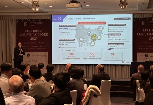 이미지 확대보기12일 경자청에 따르면 주한유럽상공회의소 부산 지부가 주최한 이번 행사에는 유럽 기업 및 유관기관 관계자 약 120명이 자리했다. 경자청은 이날 행사에 특별 초청되어 투자설명회 세션을 통해 부산진해경제자유구역의 핵심 전략산업, 입지적 장점, 차별화된 글로벌 비즈니스 환경 및 투자 인센티브 등을 소개하며 글로벌 경쟁력을 강조했다.
