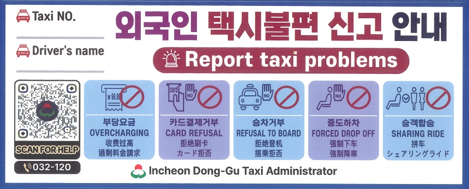이미지 확대보기인천시 동구는 외국인 관광객을 대상으로 한 불법 택시 영업을 근절하고 이용 편의를 높이기 위해‘불편 신고 QR스티커’를 택시에 부착한다고 14일 밝혔다.