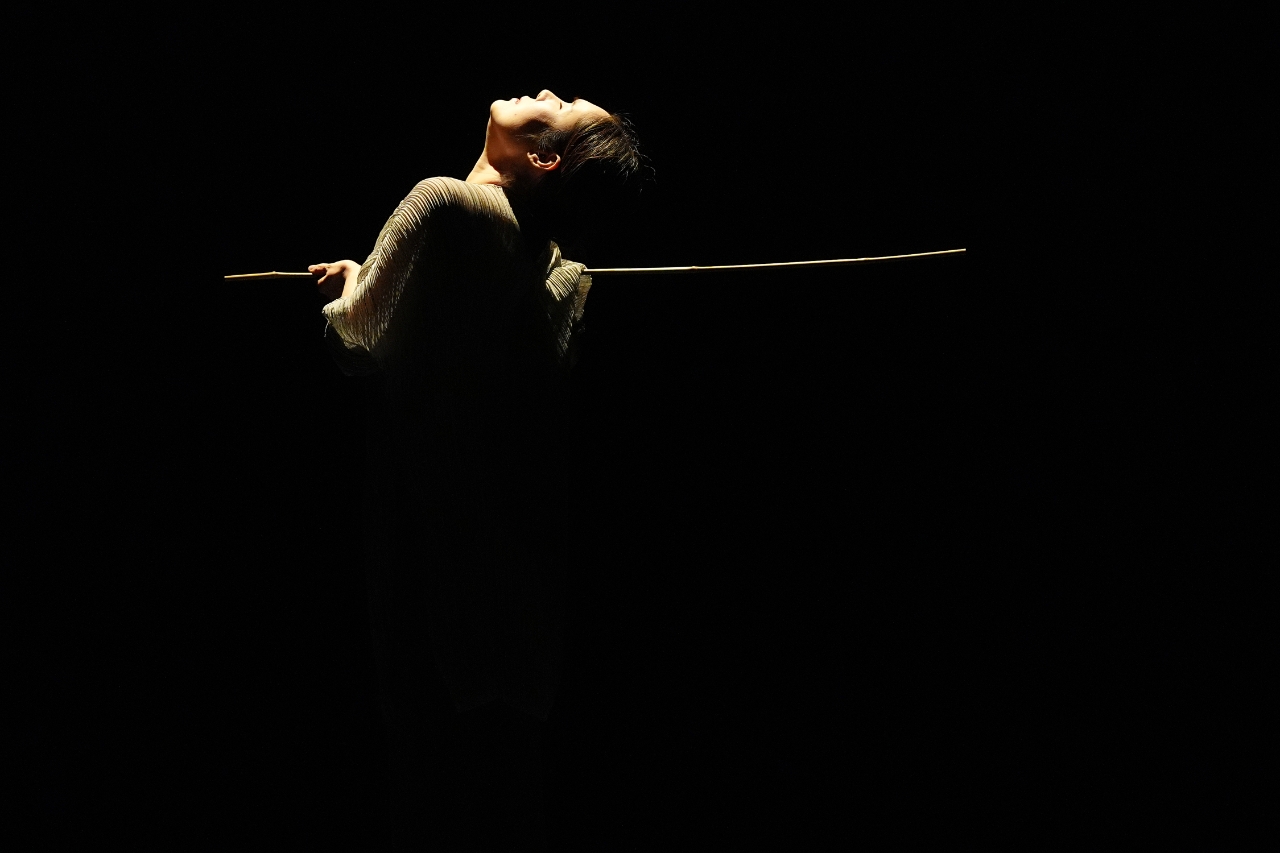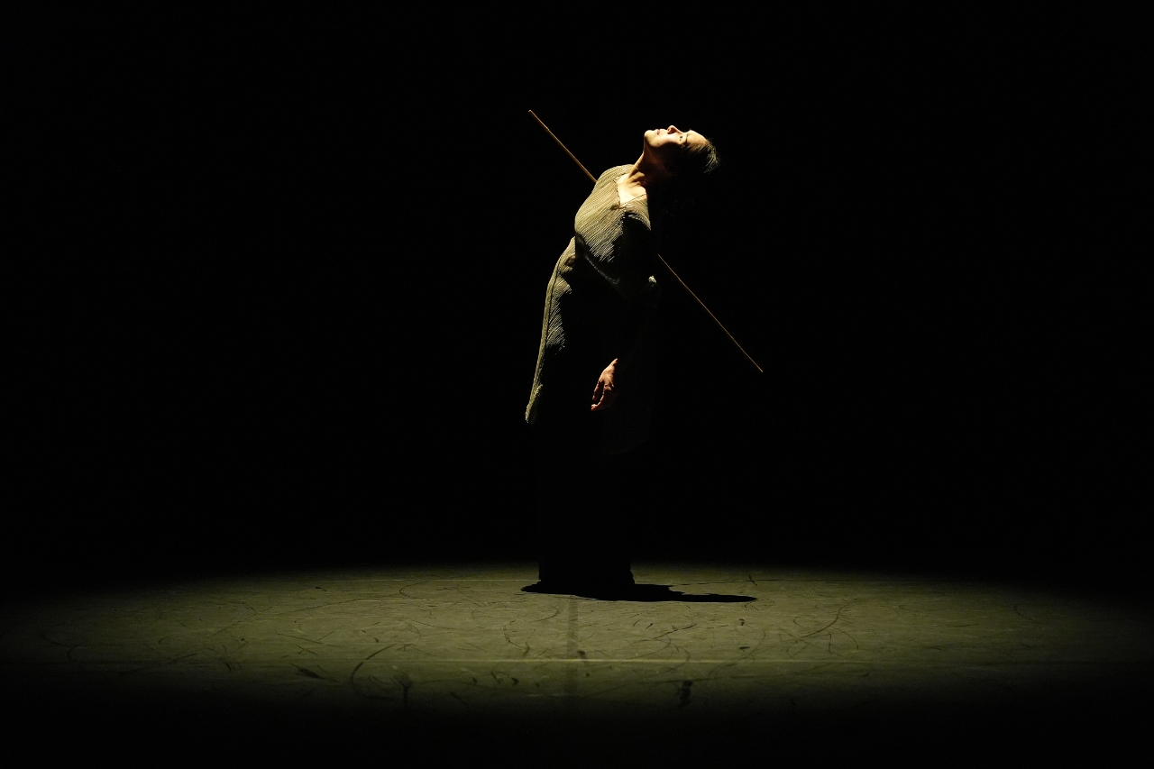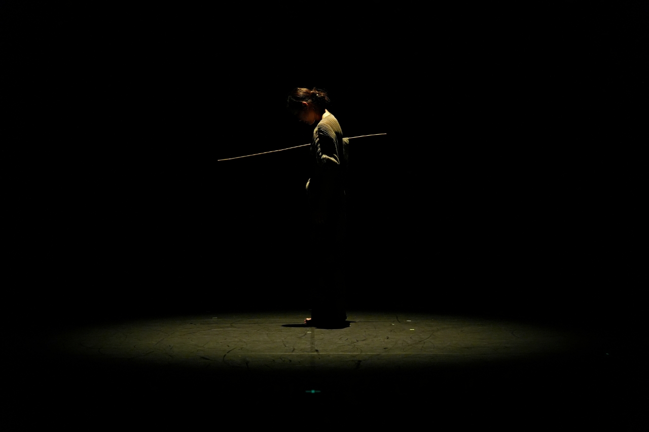 여인과 같이하는 긴 나무막대기, 즉 화살은 ‘내 안의 결단’의 상징이며. 화살을 맞고 서 있는 첫 장면과 마지막에 놓인 화살을 넘어서는 마지막 순간, 관객은 삶과 죽음, 머묾과 떠남이 겹쳐진 미세한 균열을 몸으로 경험하게 된다. 화살은 서사적 소품이 아니라 ‘의지를 시각화한 선(line)’으로 기능하며, 곡선적이고 유동적인 신체와 긴장 관계를 형성한다. 몸을 관통한 화살의 정지는 죽음의 재현이라기보다, 결단이 시간 속에 고정되는 한 순간을 드러내는 장치이다.