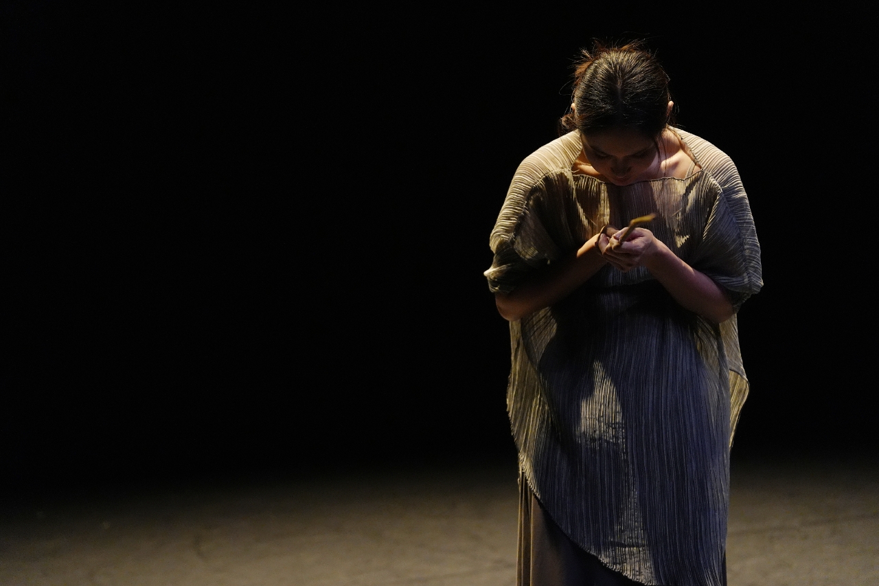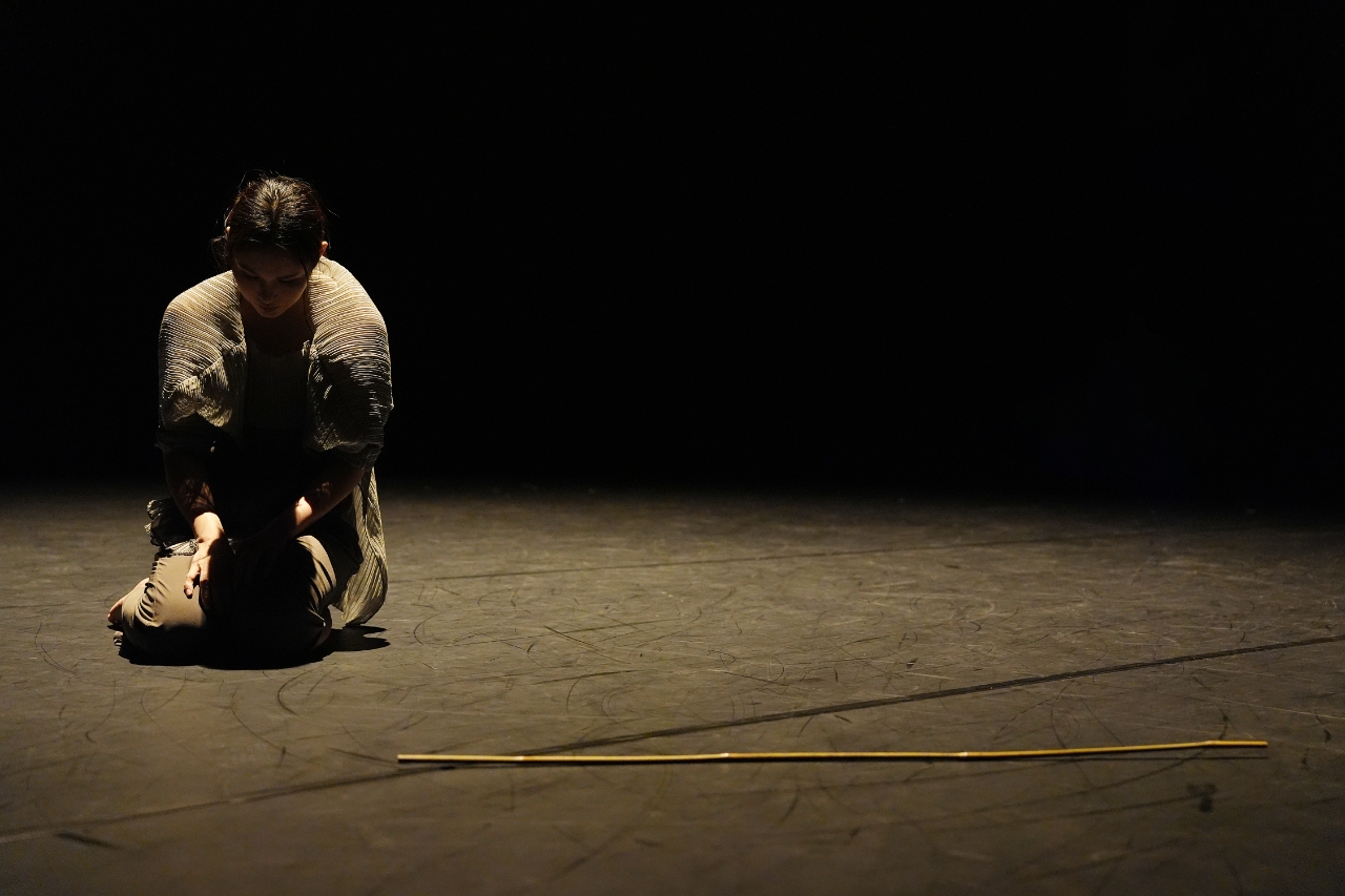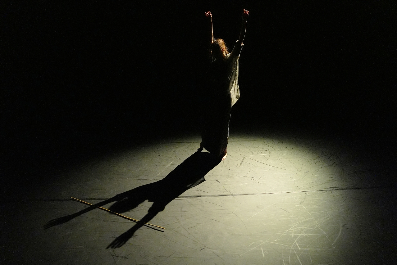 여인과 같이하는 긴 나무막대기, 즉 화살은 ‘내 안의 결단’의 상징이며. 화살을 맞고 서 있는 첫 장면과 마지막에 놓인 화살을 넘어서는 마지막 순간, 관객은 삶과 죽음, 머묾과 떠남이 겹쳐진 미세한 균열을 몸으로 경험하게 된다. 화살은 서사적 소품이 아니라 ‘의지를 시각화한 선(line)’으로 기능하며, 곡선적이고 유동적인 신체와 긴장 관계를 형성한다. 몸을 관통한 화살의 정지는 죽음의 재현이라기보다, 결단이 시간 속에 고정되는 한 순간을 드러내는 장치이다.