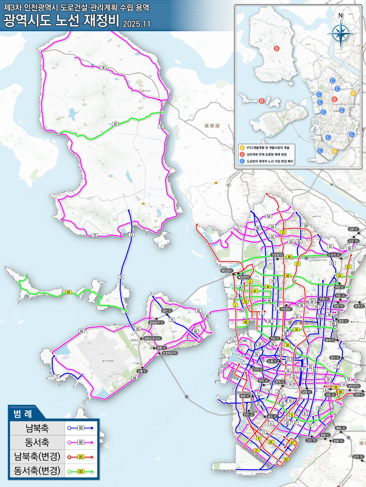 이미지 확대보기인천시는 22일 송도·청라 경제자유구역과 계양 테크노밸리(TV) 개발계획, 고속도로 건설 및 교통혼잡도로 개선사업 등 국가 상위계획을 반영해 광역시도 노선 체계를 재정비하고 이를 고시했다고 밝혔다.