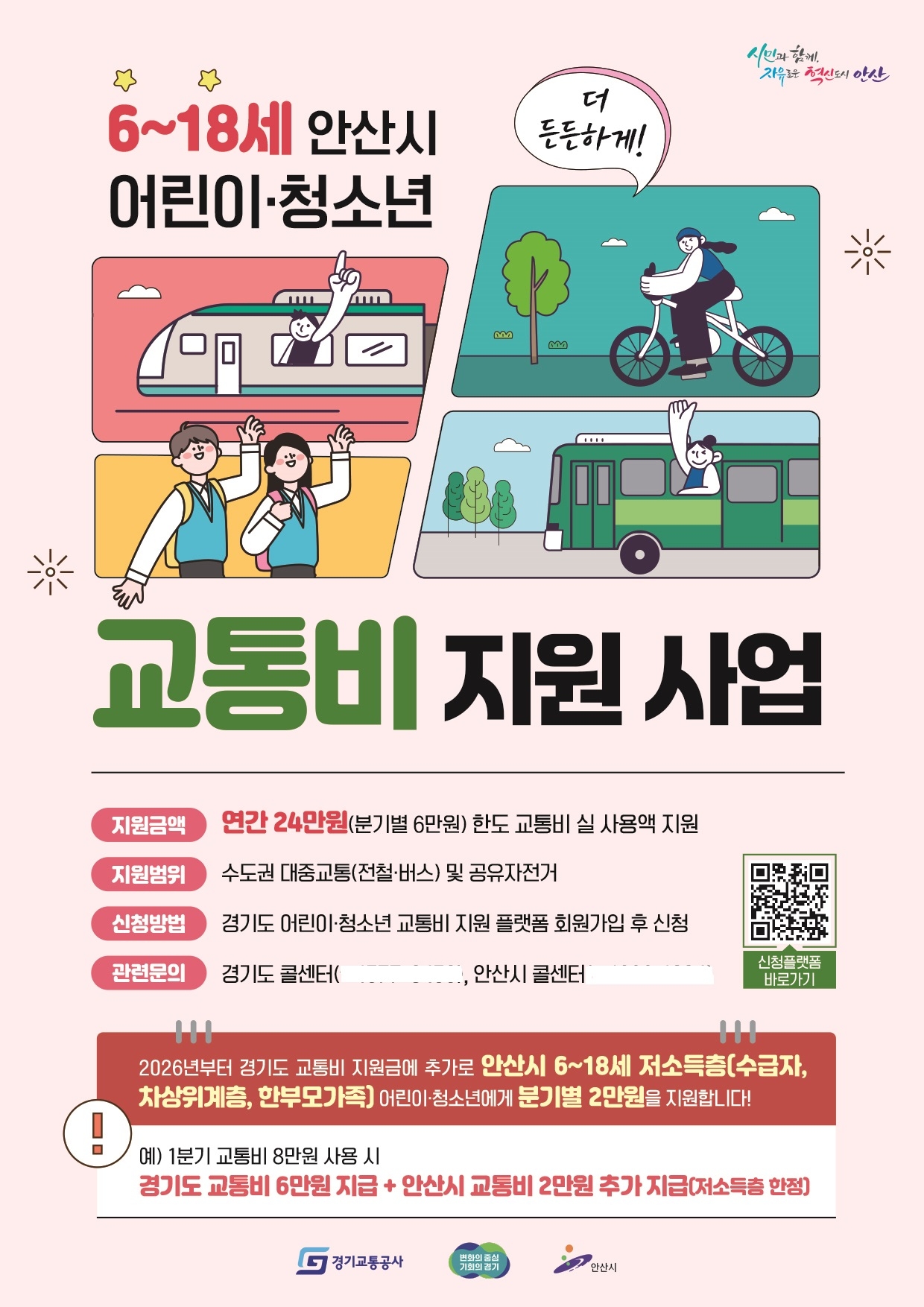 이번 사업은 ‘경기도 어린이·청소년 교통비 지원 사업 플랫폼’과 연계해 운영되며 연 최대 24만원인 경기도 지원금을 모두 사용한 경우, 시가 연 최대 8만원까지 지원해 연 최대 도합 32만원의 교통비 정책 혜택을 받을 수 있다.