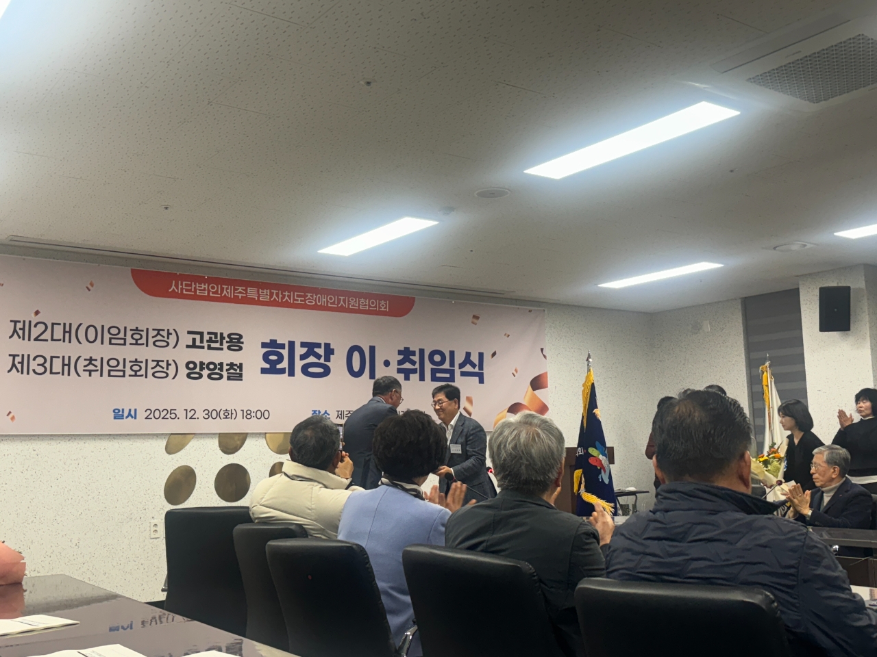 (사)제주특별자치도장애인지원협의회는 30일 제주바다만찬 씨갤러리에서 제2대 고관용 회장과 제3대 양영철 회장의 이·취임식을 개최했다.양영철 신임 회장 "13년의 발자취, 책임으로 잇겠다"