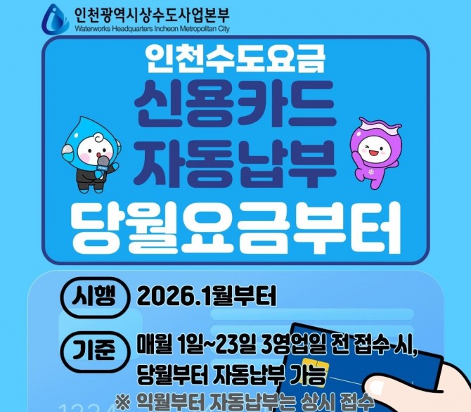 신용카드 자동납부를 신청하면 해당 월에 청구된 수도 요금부터 자동납부가 진행된다. 본부는 이와 같은 폭넓은 신청 기간이 광역지자체 가운데 가장 넓은 수준이라고 설명했다.