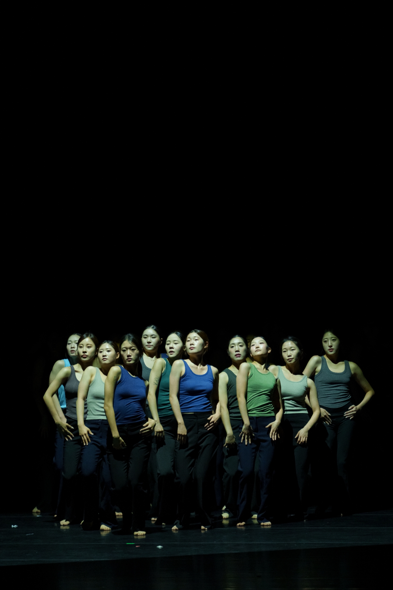 ‘청춘코드’ : ‘우리는 하나’라는 선언으로 시작되지만, 현대무용의 몸들은 각자의 호흡과 속도로 미세하게 빗나간다. 군무의 에너지는 통제되지 않은 리듬과 감각의 과잉으로 흩어진다. 청춘은 미래를 향한 서사도 정렬되지 못한 몸들이 스스로를 설명하지 못한 채 진동하는 상태로 드러난다. 동작의 어긋남과 타이밍의 불일치는 완성되지 못한 기술이 아니라, 하나가 되려는 욕망이 실패하는 순간에만 발생하는 관계의 밀도이다. 이 작품은 함께 있음의 확신을 제시하지 않고, 동시적이지만 일치하지 않는 몸들이 흔들리며 버티는 불확실성 자체를 끝까지 물질화한다.