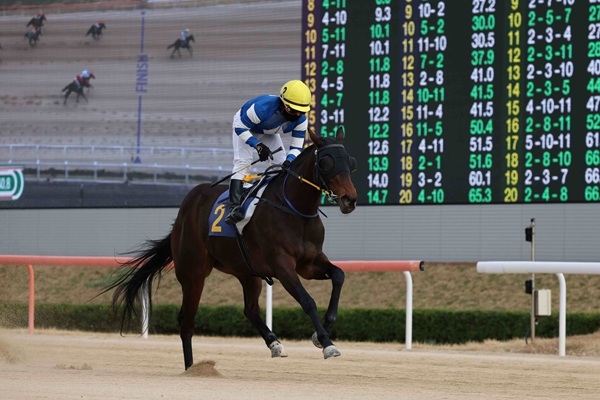 이미지 확대보기8일 렛츠런파크 부산경남에 따르면 이날 경주마 '벌교마술사'에 기승한 서승운 기수는 경주 마지막까지 선두권에서 치열한 접전의 양상을 보였지만 선두를 지켜내며 우승을 차지했다. 특히 서 기수는 지난주 부경에서 열린 15개 경주 중 11개 경주에 출전하여 이틀간 6승을 올리는 기염을 토했다.