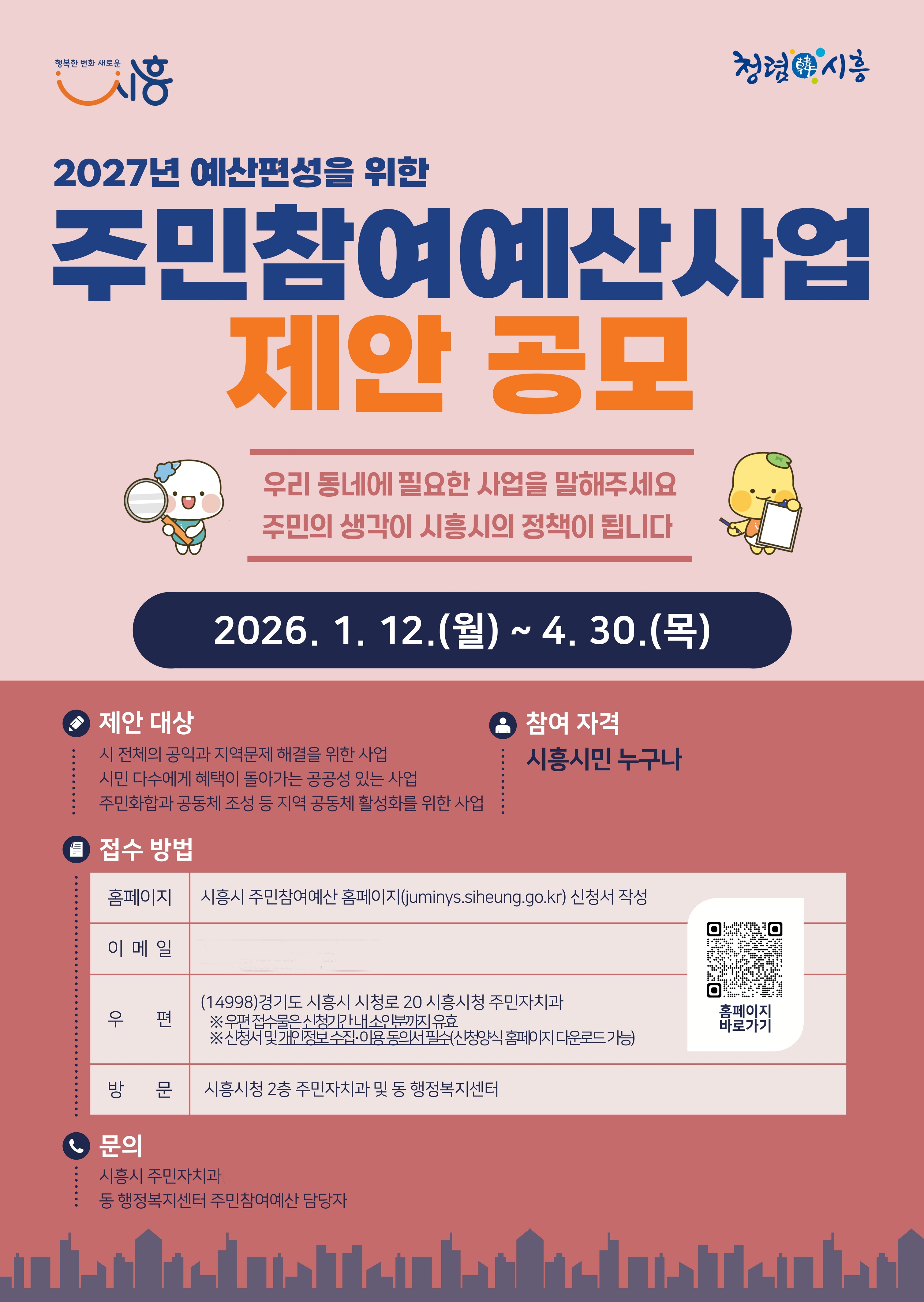 임병택 시장은 “주민참여예산제는 시민이 시정의 주인이 되는 소중한 통로”라며, “60만 시흥시민의 창의적이고 소중한 제안들이 시흥의 미래를 바꾸는 정책으로 이어질 수 있도록 많은 관심과 참여를 부탁드린다”고 말했다.
