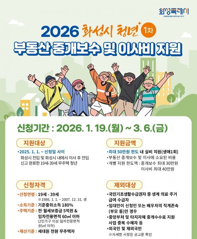 지원 규모는 200명으로 예정돼 있으며, 지원 대상은 2025년 1월 1일 이후부터 신청일까지 화성특례시로 전입하거나 화성특례시 내에서 이사 후 전입신고를 완료한 무주택 청년이다.