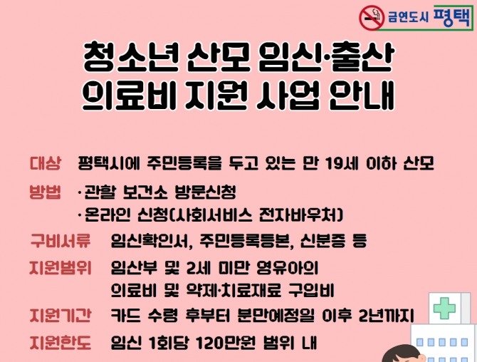 지원 대상은 평택시에 주민등록이 되어 있는 청소년 산모로, 소득 수준과 관계없이 신청할 수 있으며, 임신 확인 후 평택·송탄보건소 또는 ‘사회서비스 전자바우처’ 포털을 통해 온라인으로 신청하면 된다.