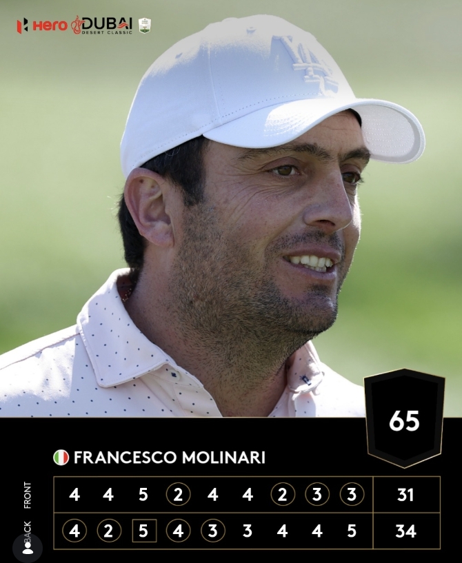 몰리나리는 7번홀부터 5개홀 연속 버디를 하며 버디 8개, 보기 1개로 7언더파 65타를 쳐 미카엘 린드버그(스웨덴)를 1타 차로 제치고 단독 선두에 올랐다. 몰리나리는 DP월드투어 6승을 갖고 있다.