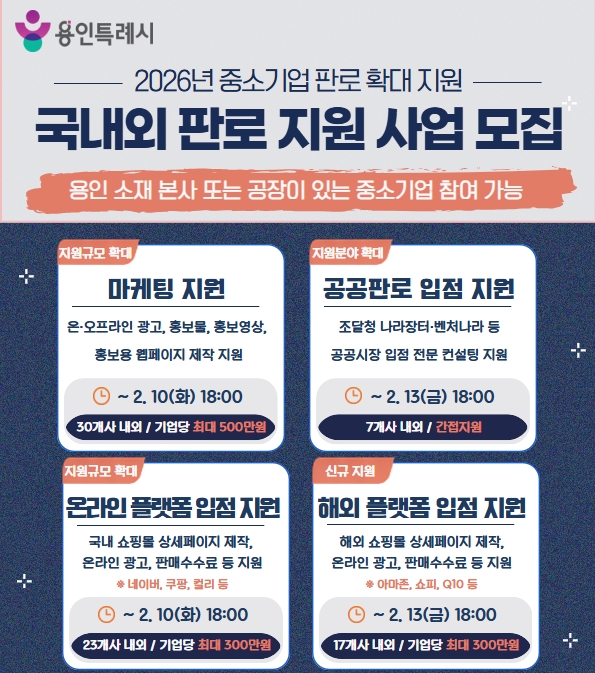 지원 대상은 용인시에 본사 또는 공장이 있는 중소기업으로, 세부 자격요건은 사업별 공고를 통해 확인할 수 있다.