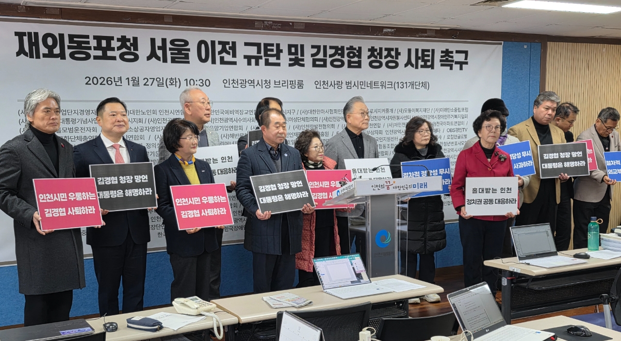 이미지 확대보기인천 여론은 심상치 않은 분위기다. 인천 범시민 네트워크 131개 시민·사회단체는 인천시 브리핑룸에서 이 날 오전 공동 기자회견문을 통해 김 청장 망언을 규탄했다. “재외동포청 인천 입지는 정당한 국가 정책 절차”라고 밝혔다.