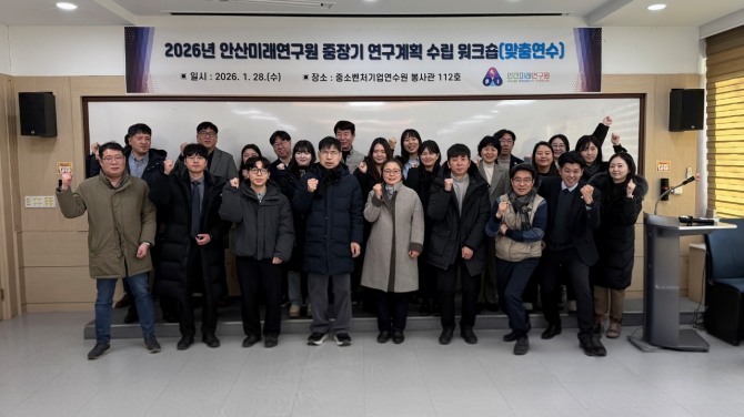 이날 워크숍에는 안산미래연구원 전 직원과 안산시 관계자 등 약 30명이 참석했으며, 도시계획, 문화·관광, 환경, 에너지, 사회복지, 산업경제, 교통, 도시행정 등 8개 연구 분야별 연구 성과와 2026년 단기 연구계획, 향후 중장기 연구 방향에 대한 발표와 토론이 진행됐다.