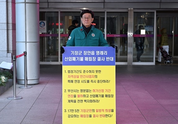 이미지 확대보기이날 정 군수는 시청 1층 출입구에서 피켓을 들고 △기장군민 희생 강요하는 산폐장 결사 반대 △허가 신청기간 연장 불허 △사업 전면 백지화 등을 요구하며 부산시의 책임 있는 결단을 촉구했다.
