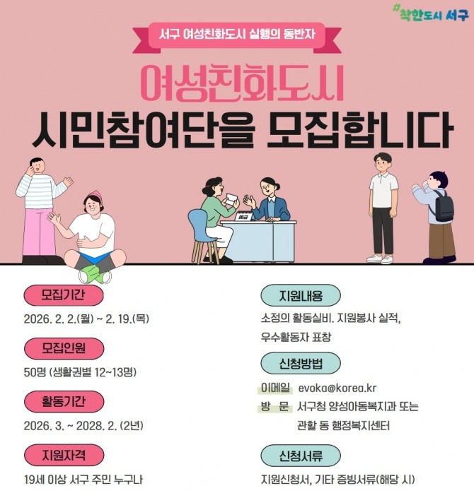 신청은 오는 19일까지며 참여를 희망할 경우 서구청 누리집 고시공고란의 관련 서류를 준비해 서구청 양성아동복지과 또는 동 행정복지센터에 방문하거나 전자우편(evoka@korea.kr)으로 제출하면 된다.