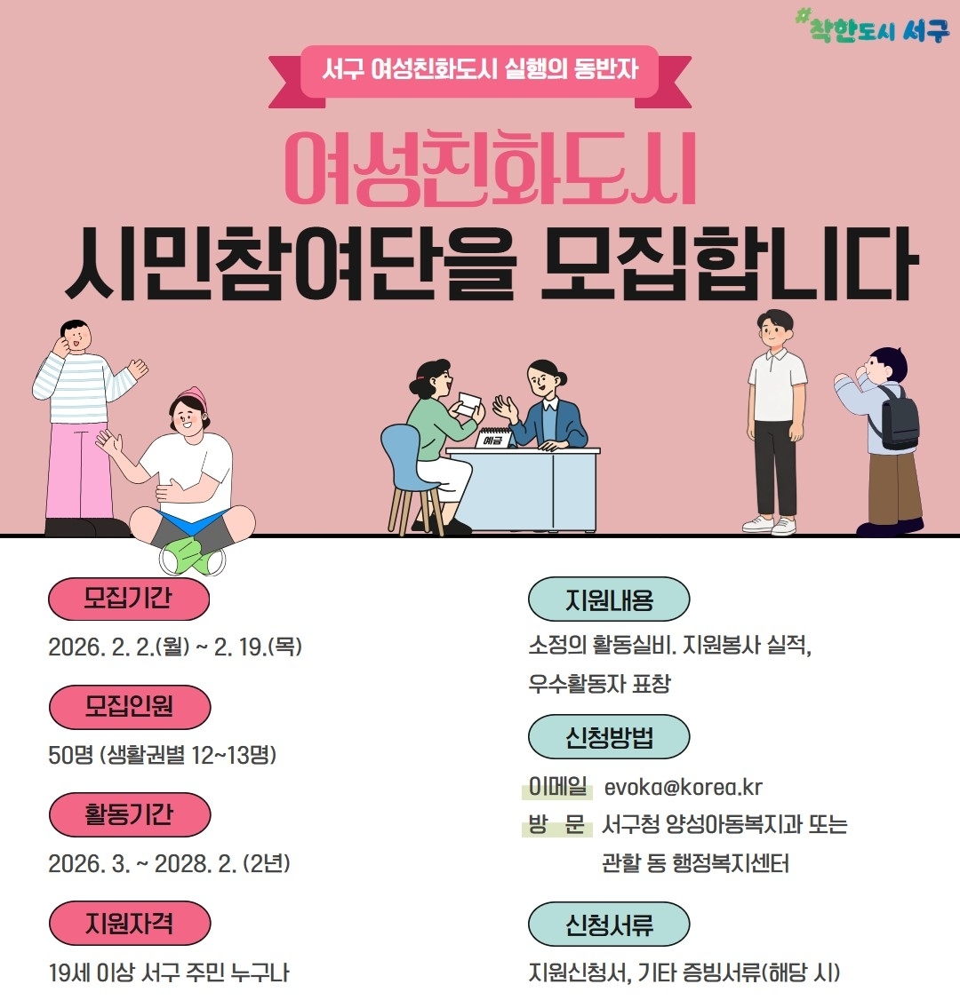 김민정 양성아동복지과장은 “시민참여단 분과 운영을 통해 주민 참여의 폭을 넓히고 생활 현장에서 체감할 수 있는 여성친화도시 정책을 추진하겠다”며 “지역 정책에 관심 있는 주민들의 적극적인 참여를 바란다”고 강조했다.