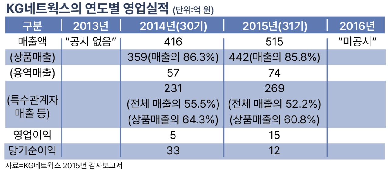 실제 KG네트웍스의 2014년 총매출 416억원 중 상품매출은 359억원(86.3%)에 달했다. 주력 업종인 용역매출은 57억 원(13.7%)에 그쳤다. 같은 기간 특수관계기업 매출은 231억원(55.5%)이었다.