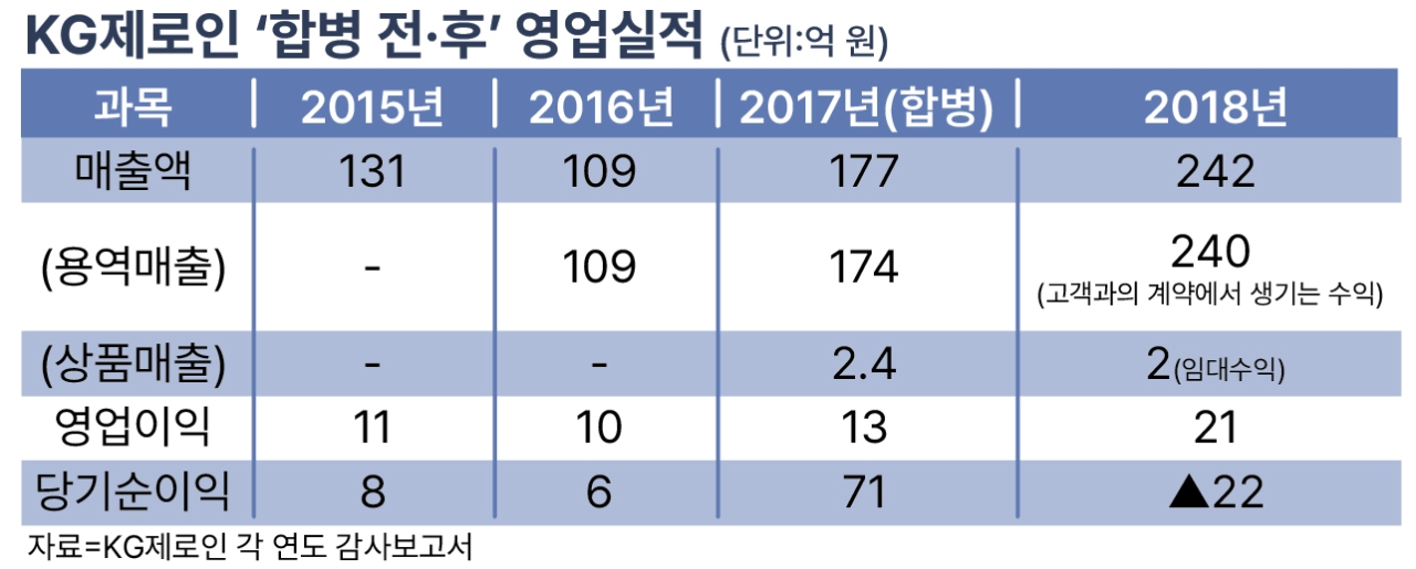 그러나 합병 후 KG제로인의 매출은 2017년 177억원, 2018년 242억원에 머물렀다. 이는 합병 전 두 회사의 2015년 합산 매출 646억원(515억+131억 원)의 절반에도 미치지 못하는 수치다. 합병 후 상품매출이 사라졌거나 대폭 줄어든 탓으로 풀이된다.