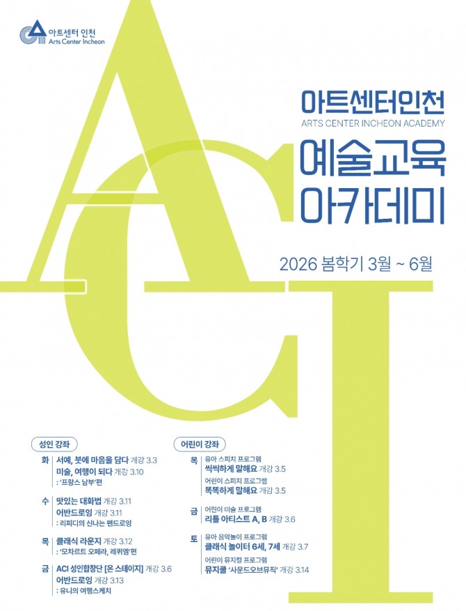 이미지 확대보기한편 아트센터인천 예술교육 아카데미는 지난 2021년 출범 이후 정규강좌와 원데이 클래스 등 다양한 프로그램을 선보이며 시민들의 문화예술 향유 기회를 꾸준히 확대해왔다. 운영 중인 강좌들이 잇따라 조기 마감되는 등 높은 참여율을 기록하며 대표적인 시민 참여형 예술교육 프로그램으로 자리 잡고 있다.