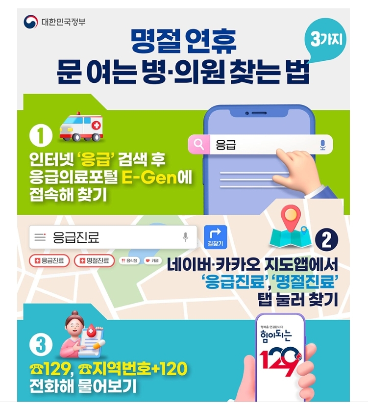 이번 설 연휴 문 여는 의료기관과 약국은 총 1262개소이며, 경증 환자의 분산을 통해 응급실 과밀화를 해소하고자 문 여는 병․의원 수를 지난 추석 연휴(3일) 대비 31% 추가 확보했다.