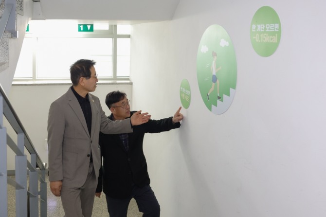 이미지 확대보기이번 캠페인은 엘리베이터 사용을 줄이고 계단 이용을 일상화해 직원들의 신체활동을 자연스럽게 늘리는 한편, 전력 사용 절감과 이산화탄소 배출 감소를 통해 친환경 청사 운영 문화를 확산하기 위해 마련됐다.