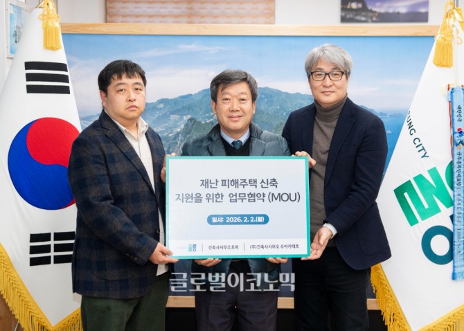 이미지 확대보기군은 지난 2일 관내 건축사인 건축사사무소 호미 대표 황성철, 건축사사무소 수아키텍츠 대표 남중기와 ‘재난 피해 주택 신축 지원을 위한 업무협약(MOU)’을 체결했다고 3일 밝혔다.