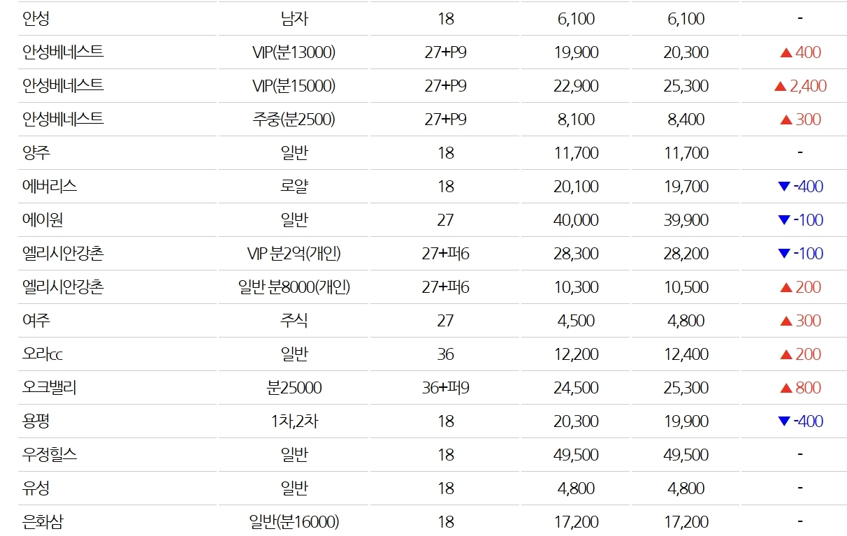 고가 회원권은 수도권 골프장들이 강세를 보이고 있다. 기흥CC, 뉴서울CC, 남서울CC, 골드CC, 지산CC가 3억원에서 4억원대에서 매도, 매수가 이뤄지고 있다. 특히 36홀의 기흥CC가 6억9500만원으로 송추CC를 1억원 차이로 바짝 뒤쫓고 있다.
