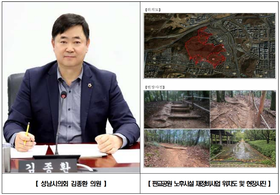 김 의원은 “판교 입주 이후 17년 동안 판교공원에 대한 전면적인 보수는 지난해에 이어 이번이 처음”이라며 “판교공원은 인근 주민들이 일상적으로 이용하는 대표적인 생활권 공원임에도 불구하고, 그간 산책로 훼손과 토사 유실 등으로 안전 문제가 반복적으로 제기돼 종합적인 정비가 시급한 상황이었다”고 설명했다.