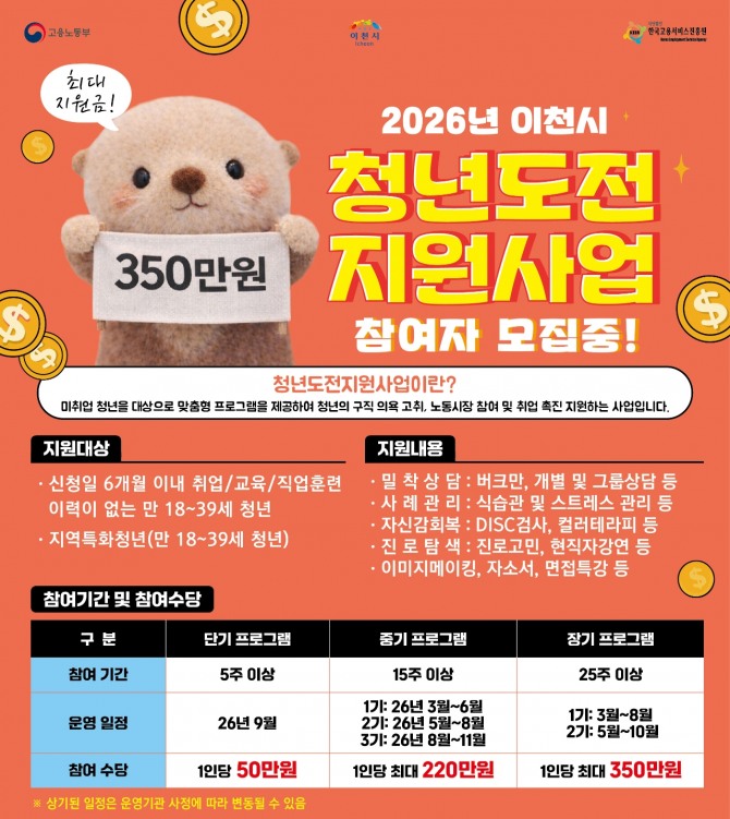 이미지 확대보기청년도전지원사업은 고용노동부와 이천시가 함께 추진하는 맞춤형 청년취업 지원사업으로, 장기간 구직활동에 어려움을 겪고 있는 청년들이 다시 노동시장에 진입할 수 있도록 돕는 프로그램이다.